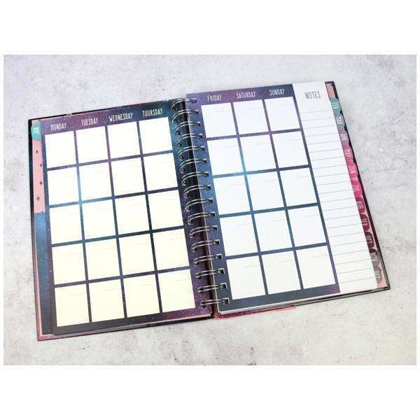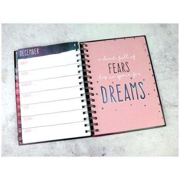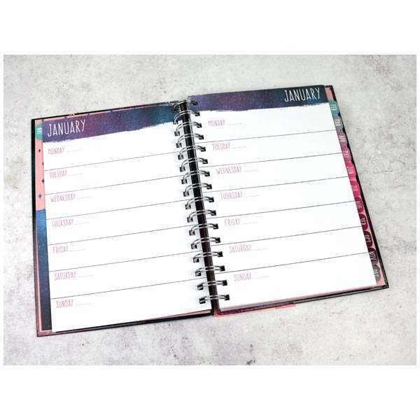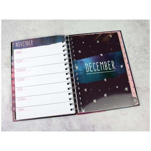 Diář má kovovou spirálovou vazbu, pevné desky a je opatřen pružnou gumičkou, aby se desky samovolně neotevíraly.