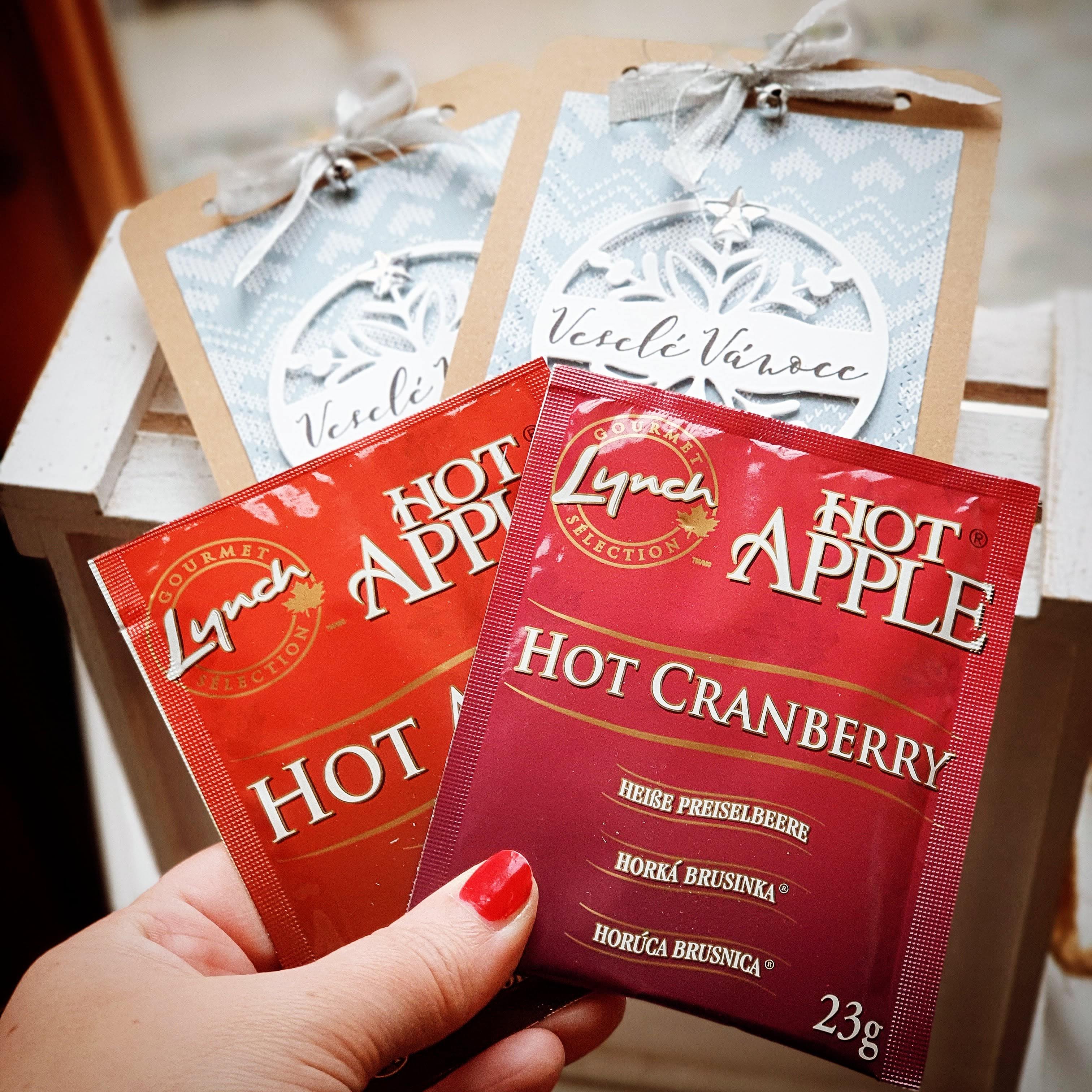 Vánočně zdobená kapsa v sobě ukrývá dva horké nápoje Hot Apple (jablíčko a brusinka).